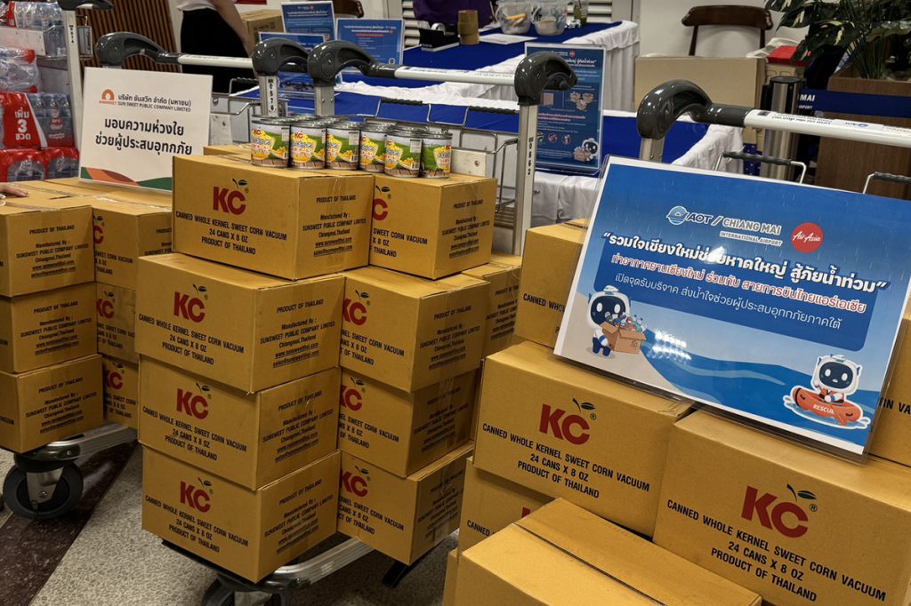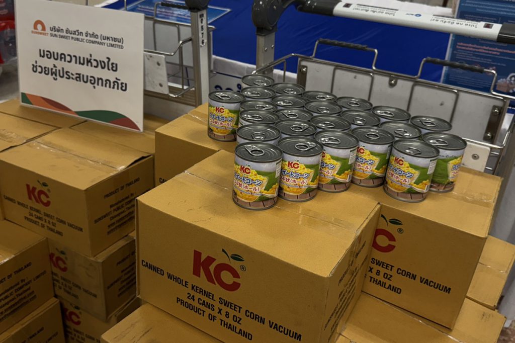 SUN ได้สนับสนุนผลิตภัณฑ์อาหารพร้อมรับประทาน ข้าวโพดหวานบรรจุกระป๋อง ตรา KC เพื่อช่วยเหลือประชาชนในพื้นที่ประสบภัยให้ได้รับอาหารที่ปลอดภัยและเพียงพอในระยะเร่งด่วน การส่งมอบจัดขึ้นผ่านความร่วมมือจากหลายหน่วยงาน ได้แก่ สมาคมผู้ผลิตอาหารสำเร็จรูป กรมประมง ท่าอากาศยานเชียงใหม่ และ สายการบินไทยแอร์เอเชีย เพื่อสนับสนุนด้านการลำเลียงสิ่งของไปยังพื้นที่ เพื่อบรรเทาความเดือดร้อน และมอบพลังใจให้แก่ผู้ที่ได้รับผลกระทบให้ก้าวผ่านสถานการณ์ครั้งนี้ไปด้วยความเข้มแข็ง