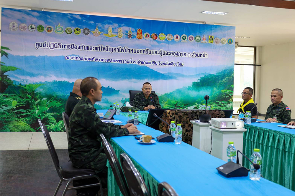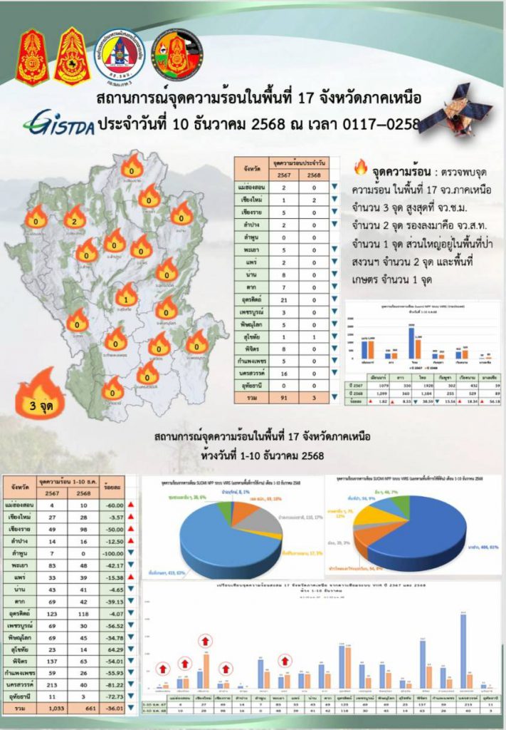 ด้าน พ.ท. วิริทธิ์พล สบบง ผู้ช่วยหัวหน้าศูนย์ควบคุมอากาศยาน ศูนย์ปฏิบัติการป้องกันและแก้ไขปัญหาไฟป่าหมอกควันและฝุ่นละอองภาค 3 ส่วนหน้า กล่าวถึงสถานการณ์ไฟป่าหมอกควันและฝุ่นละอองในพื้นที่ 17 จังหวัดภาคเหนือ ว่า ปัจจุบันภาคเหนือ มีลักษณะลมแปรปรวนและมีความเร็วลมเบาบาง การระบายอากาศน้อย โดยพบว่าสถานการณ์จุดความร้อน (Hotspot) ห้วงวันที่ 1 – 10 ธันวาคม 2568 ตรวจพบจุดความร้อนในพื้นที่ 17 จังหวัดภาคเหนือ จำนวน 661 จุด ลดลงจาก ปี 2567 จำนวน 372 จุด คิดเป็นร้อยละ 36.01 ซึ่งในปี 2568 ตรวจพบสูงสุดที่ จังหวัดอุตรดิตถ์ จำนวน 118 จุด รองลงมา คือ จังหวัดเชียงราย จำนวน 98 จุด และ จังหวัดพิจิตร จำนวน 61 จุด ส่วนใหญ่อยู่ในพื้นที่เกษตร จำนวน 419 จุด รองลงมาคือ ป่าสงวนฯ จำนวน 110 จุด และ พื้นที่เขต.สปก จำนวน 69 จุด ขณะที่จุดความร้อนประเทศเพื่อนบ้าน มีจำนวน 3553 จุด ลดลงจาก ปี 2567 จำนวน 557 จุด คิดเป็นร้อยละ 13.55 พบมากที่สุดอยู่ที่ ประเทศไทย จำนวน 1,164 จุด รองลงมาคือ ประเทศเมียนมาร์ จำนวน 1,143 จุด